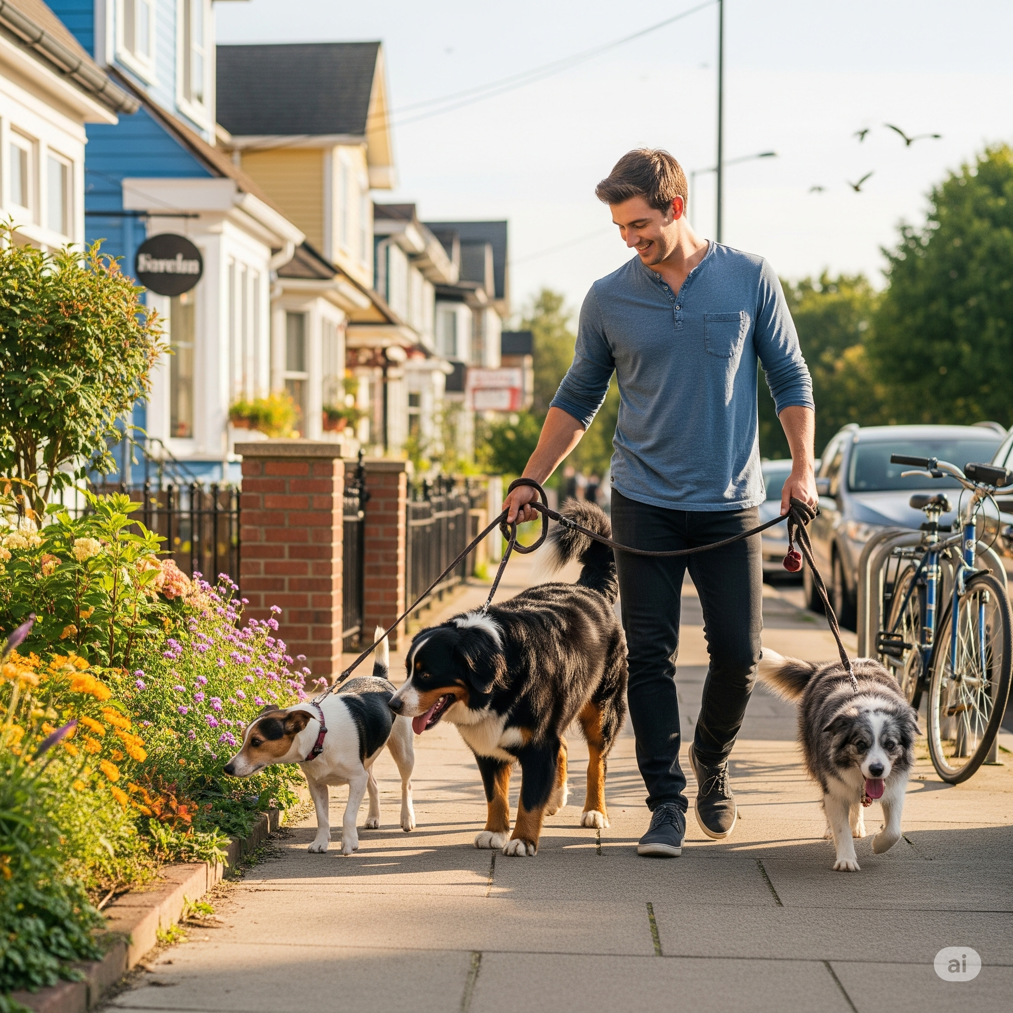 AI generated image of three calm, happy dogs walking with handler.