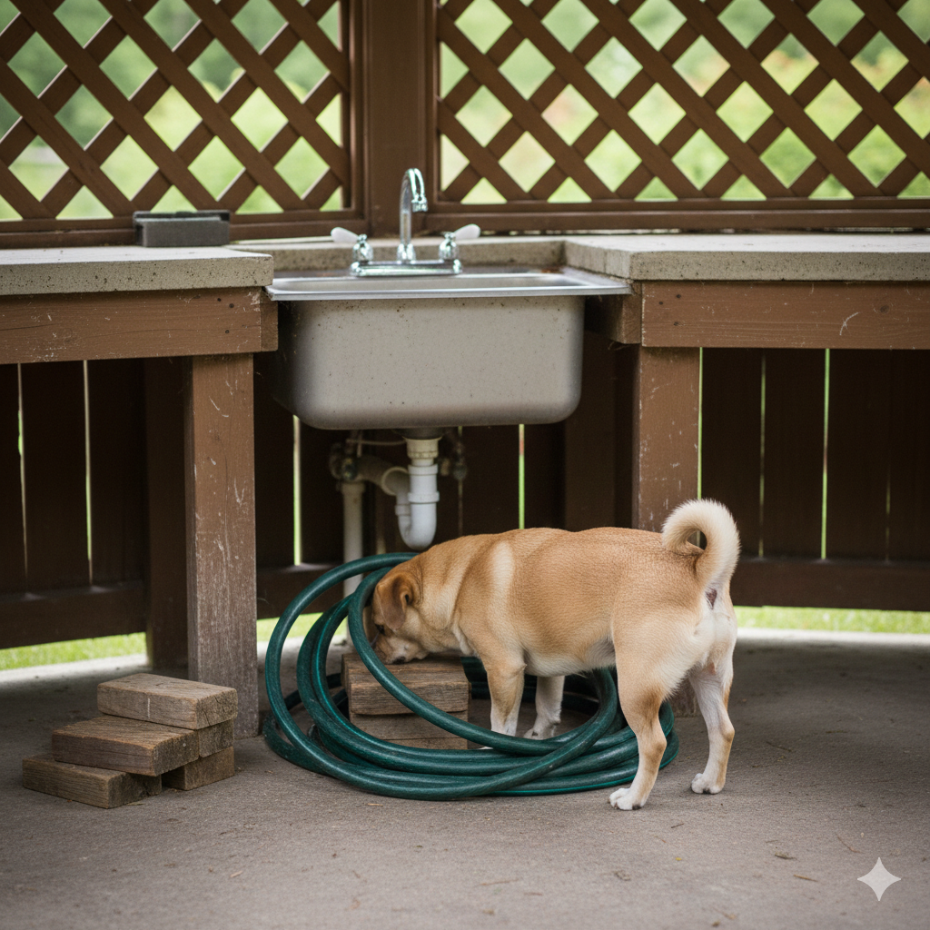 Winnie was in odor from the start line and began sniffing a partition wall made of lattice that stood between the door and the rest of the storage area. She worked odor off the flow-through divider wall, turned around and found a hefty amount of odor collecting behind her under the sink. The source of the odor was on the other side of the divider wall and was blowing through the lattice to the side Winnie was on.