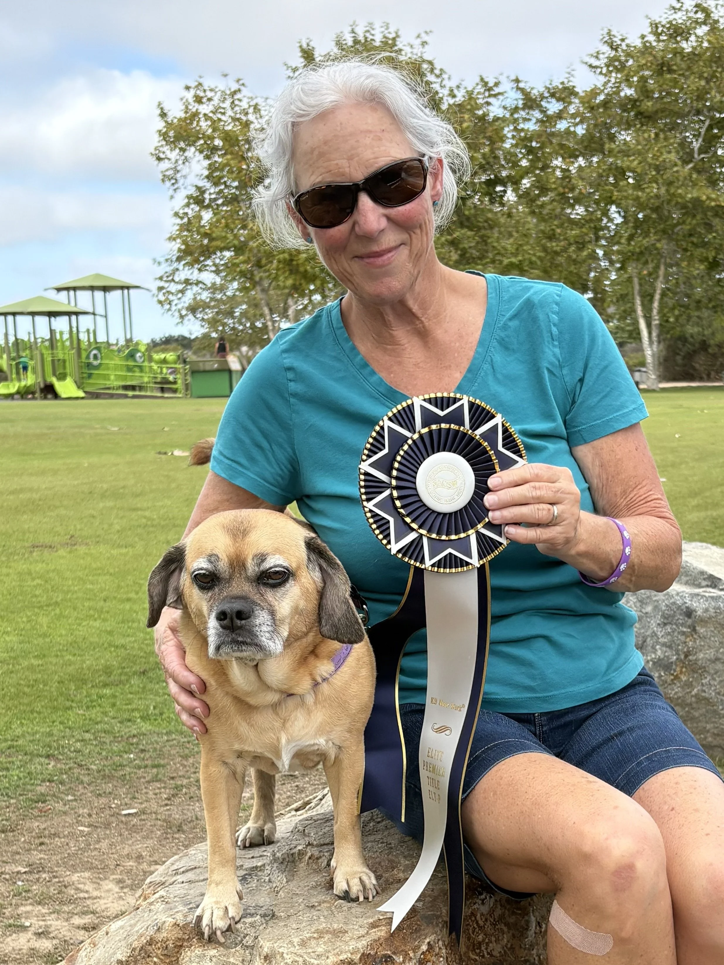 My sweet ol’ girl, Winnie, and her big ribbon for an Elite-Premier title. Huntington Beach, California. 2025