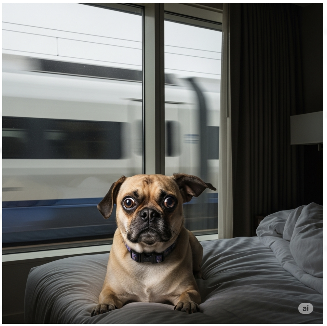 Next to the hotel, maybe fifteen feet from the corner of the building where our room was, ran an active train track. We had just entered the room when the high-speed people mover thundered through. Winnie reacted with concern, so we did some “fetch and retrieve” play to deflate her arousal level.